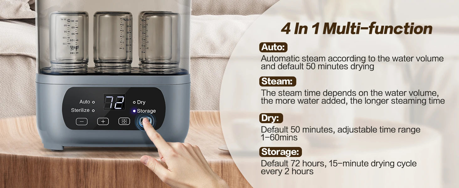 4-in-1 Functionality: A complete solution to Sterilize, Dry, Sterilize & Dry, or use as a 72-hour hygienic Storage unit.